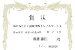 参加者自身がリザルト画面から記録証・賞状をPDFファイルとして ダウンロードできるように設定できます。ロゴやお好みの枠など自由にデザインできます。
